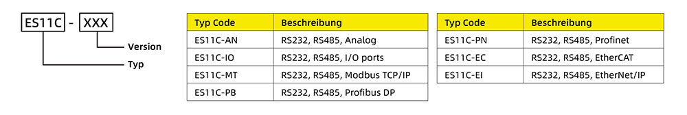 RS232, RS485, Analog, I/O-Anschlüsse, Modbus TCP/IP, Profibus DP, Profinet, EtherCAT, EtherNet/IP