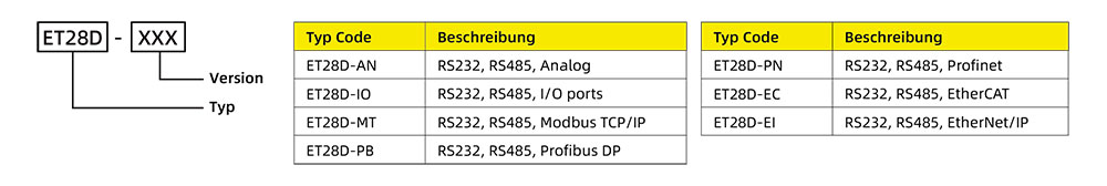 RS232, RS485, Analog, I/O-Anschlüsse, Modbus TCP/IP, Profibus DP, Profinet, EtherCAT, EtherNet/IP